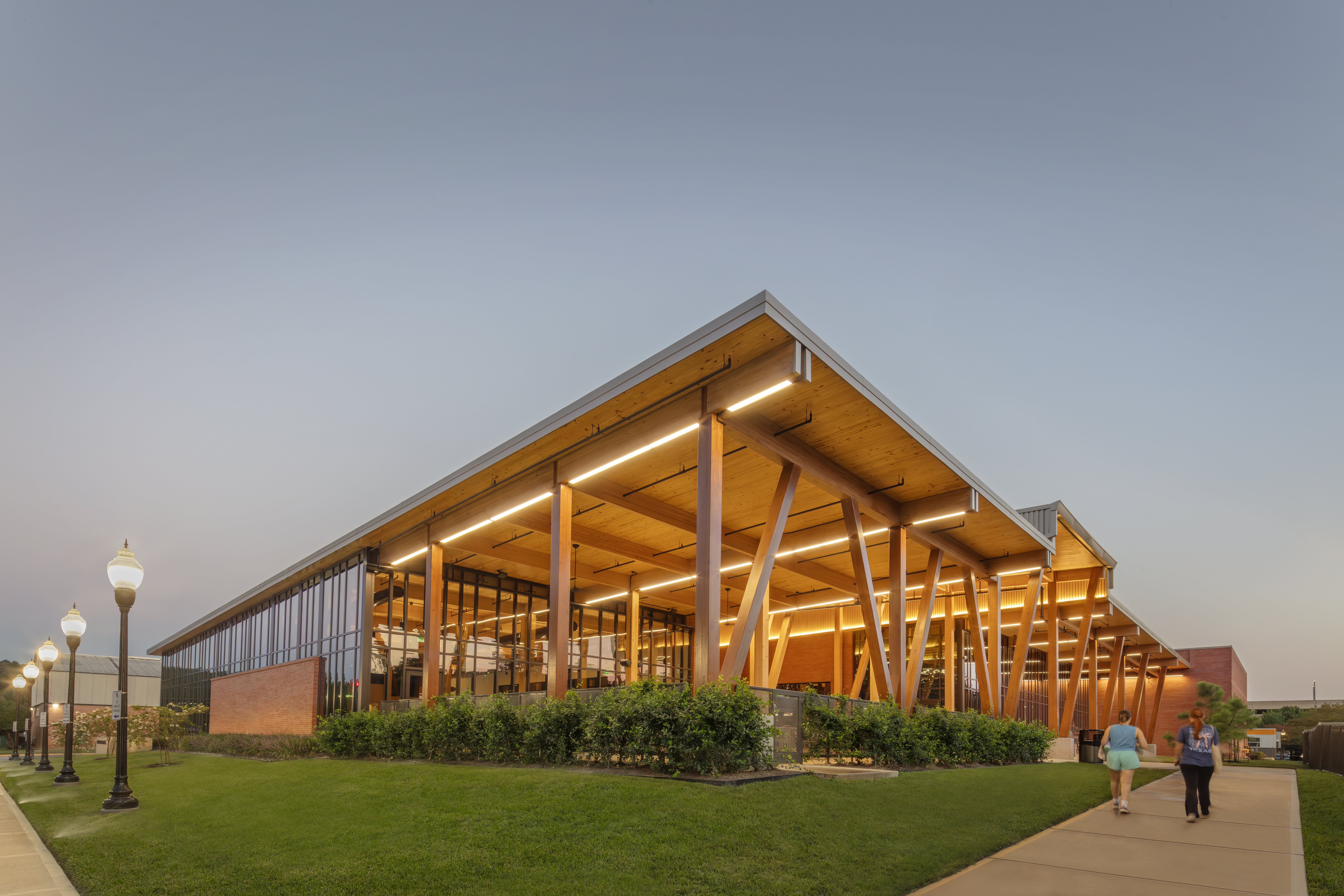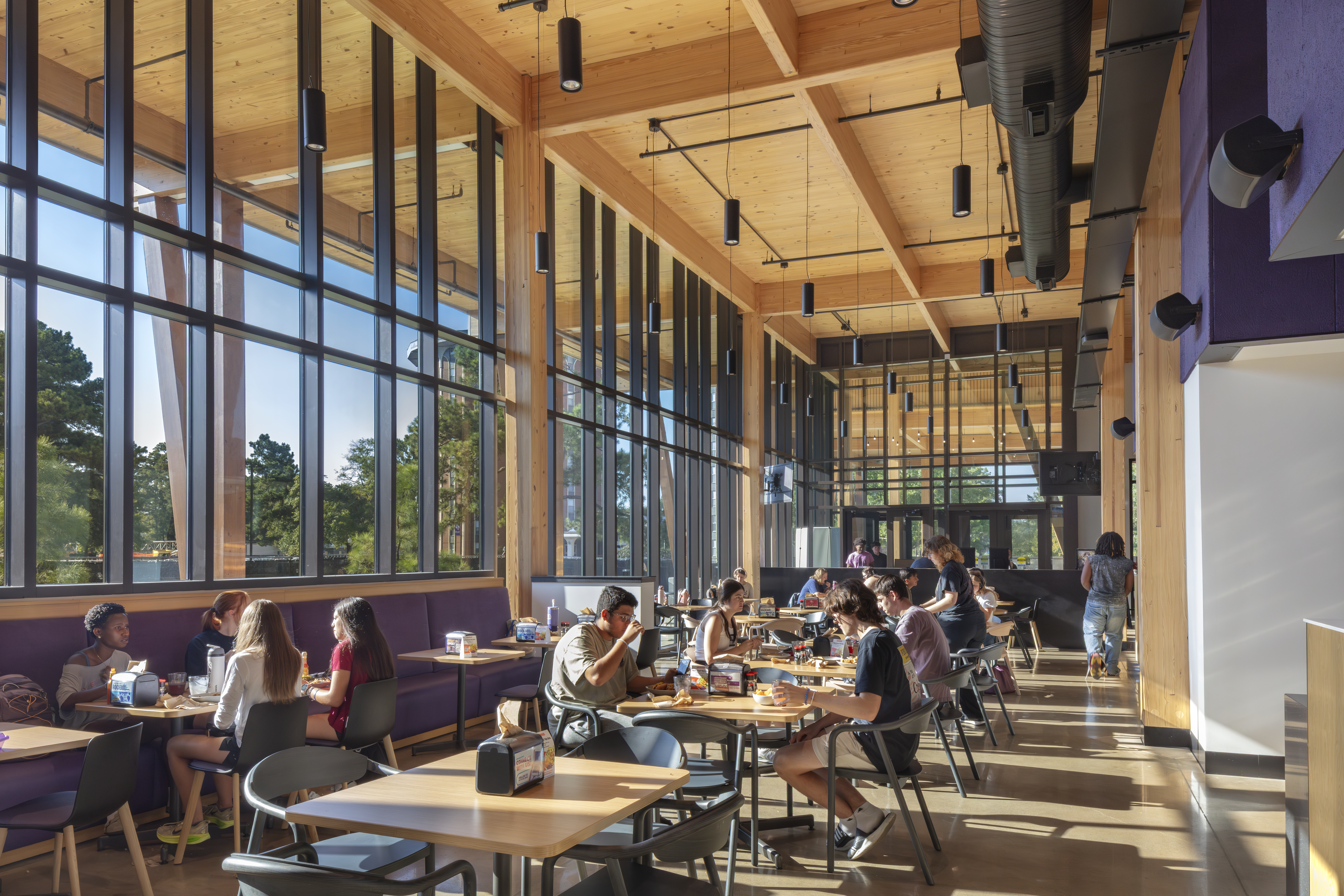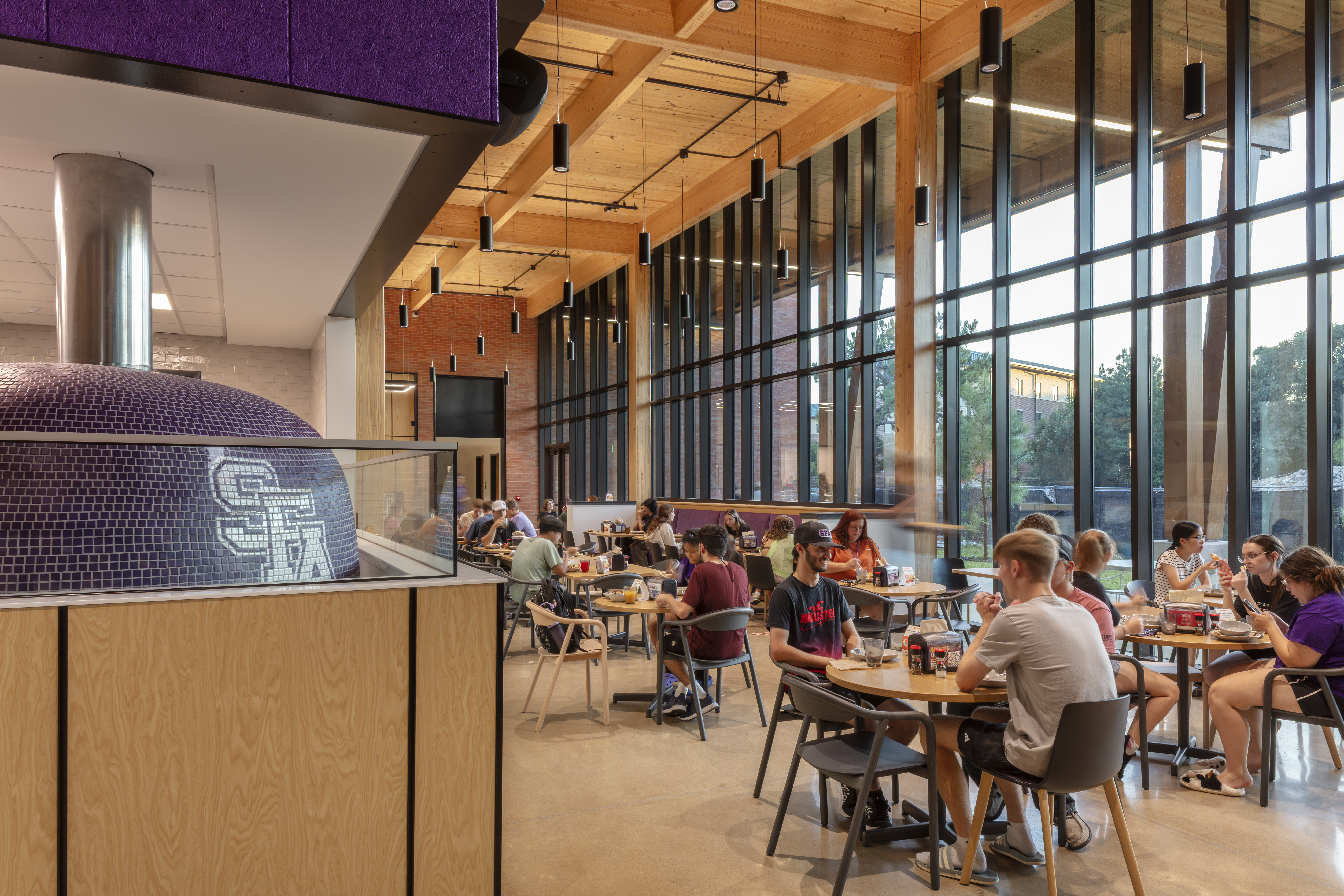 The Stephen F. Austin State University East Dining Hall marks the University of Texas System's first mass timber building in history. The 20,000 SF, one-story structure accommodates 600 patrons with 5,000 SF of outdoor patio space. The mass timber structure showcases East Texas’s forestry resources and regional building heritage, demonstrating how sustainable, locally-sourced materials can transform campus construction practices.
