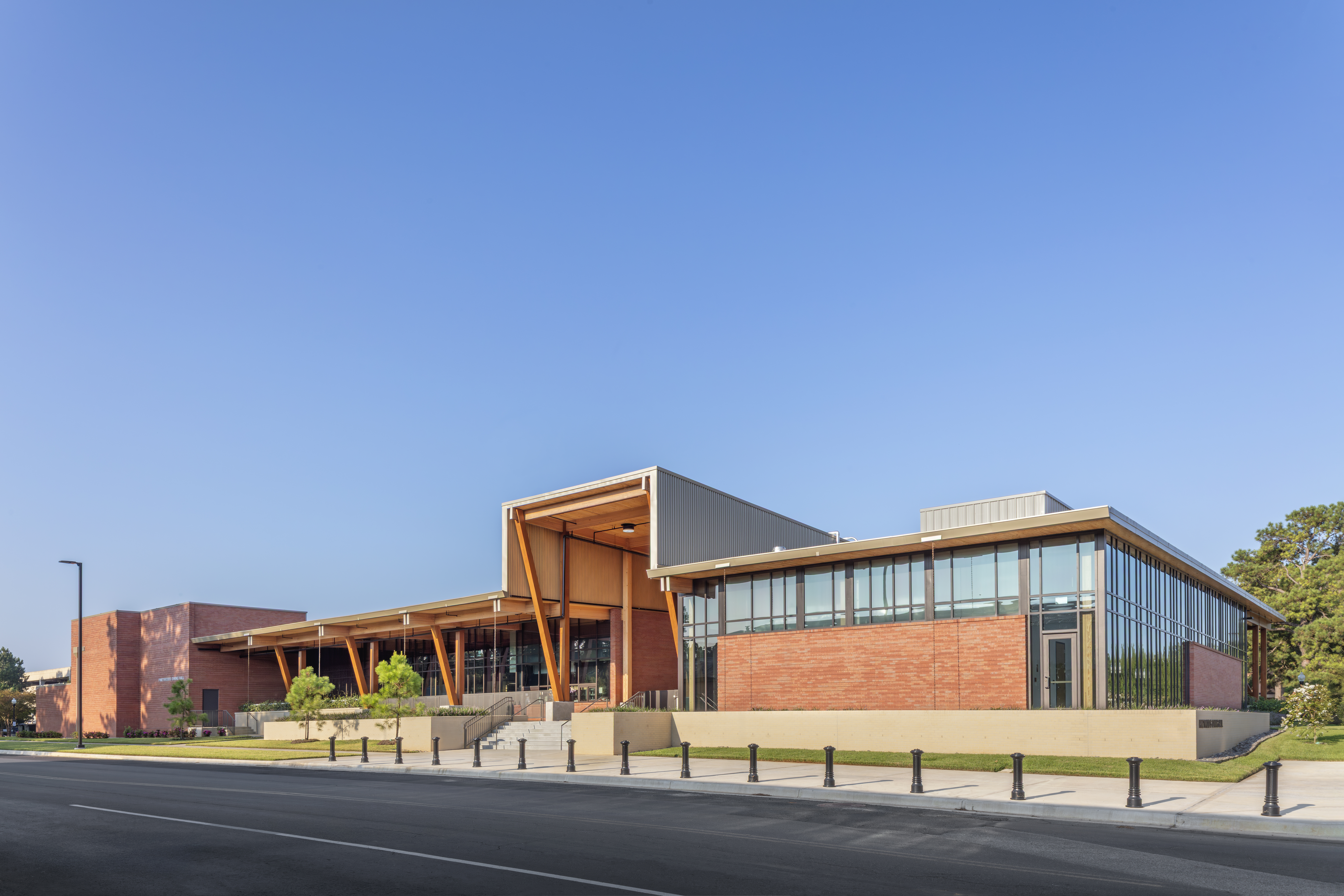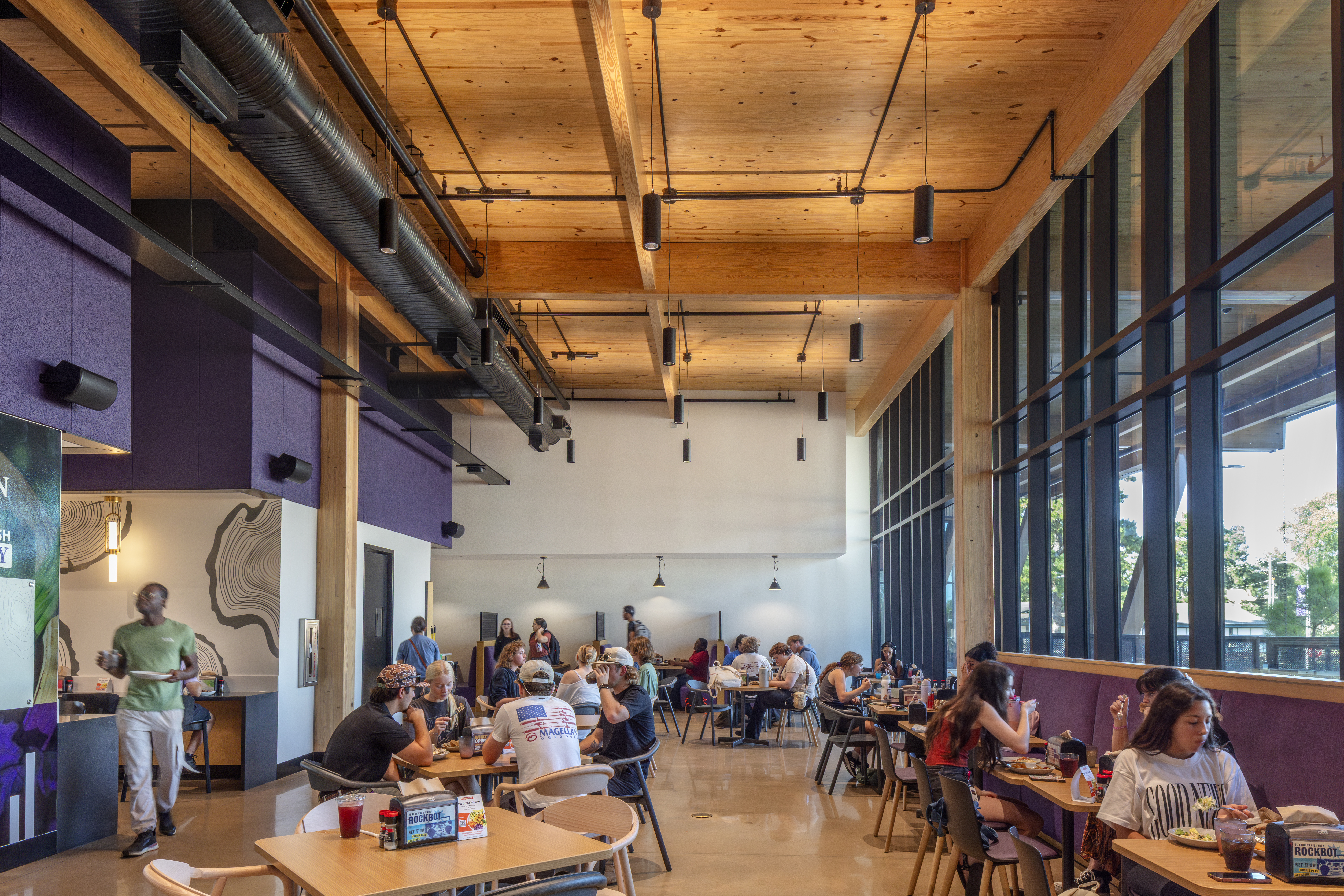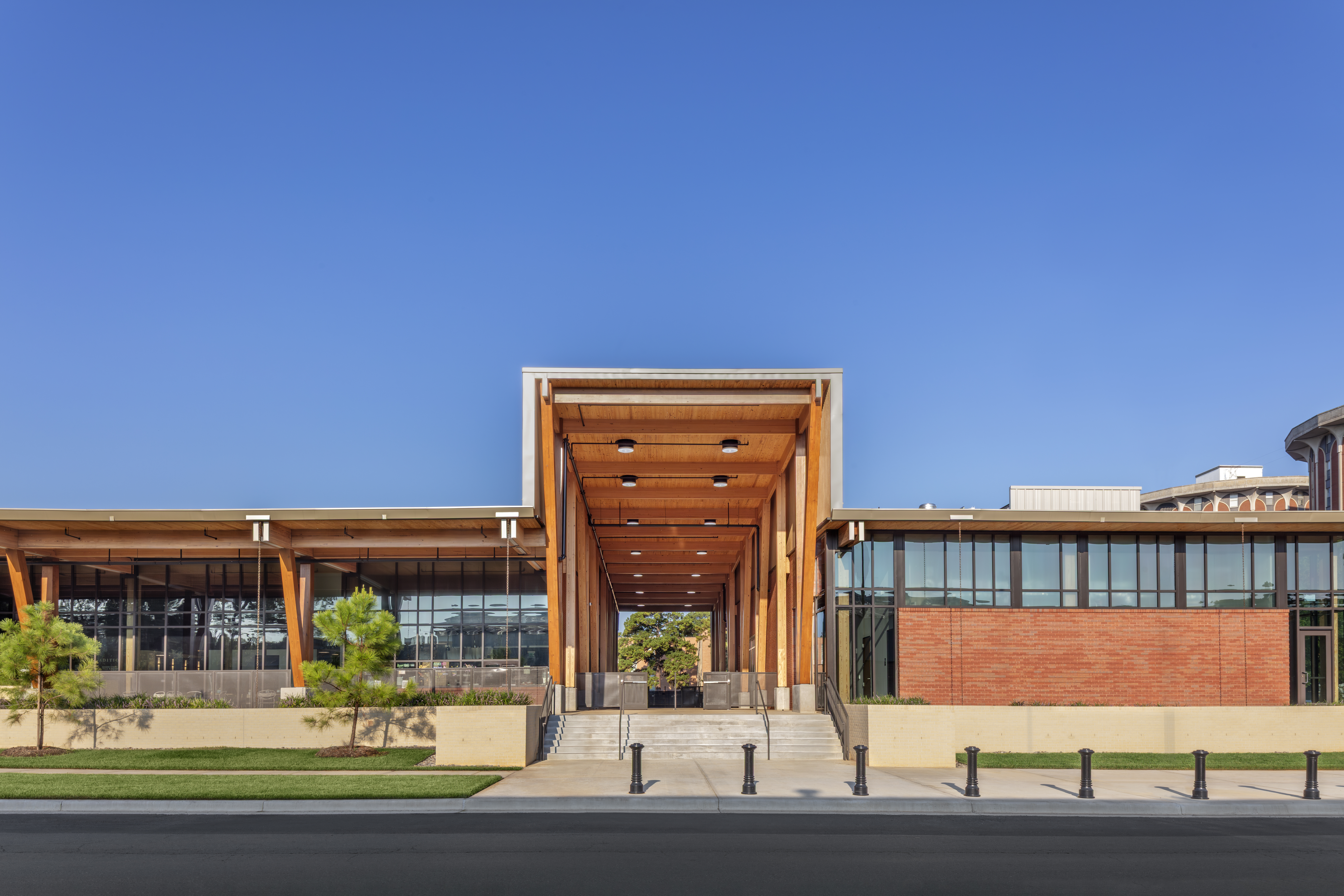 The Stephen F. Austin State University East Dining Hall marks the University of Texas System's first mass timber building in history. The 20,000 SF, one-story structure accommodates 600 patrons with 5,000 SF of outdoor patio space. The mass timber structure showcases East Texas’s forestry resources and regional building heritage, demonstrating how sustainable, locally-sourced materials can transform campus construction practices.